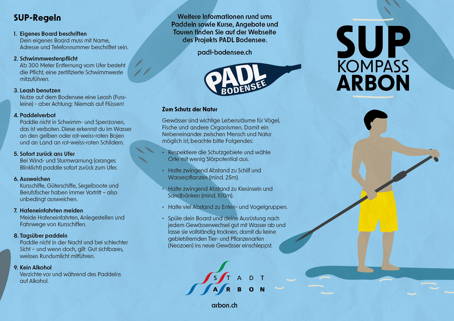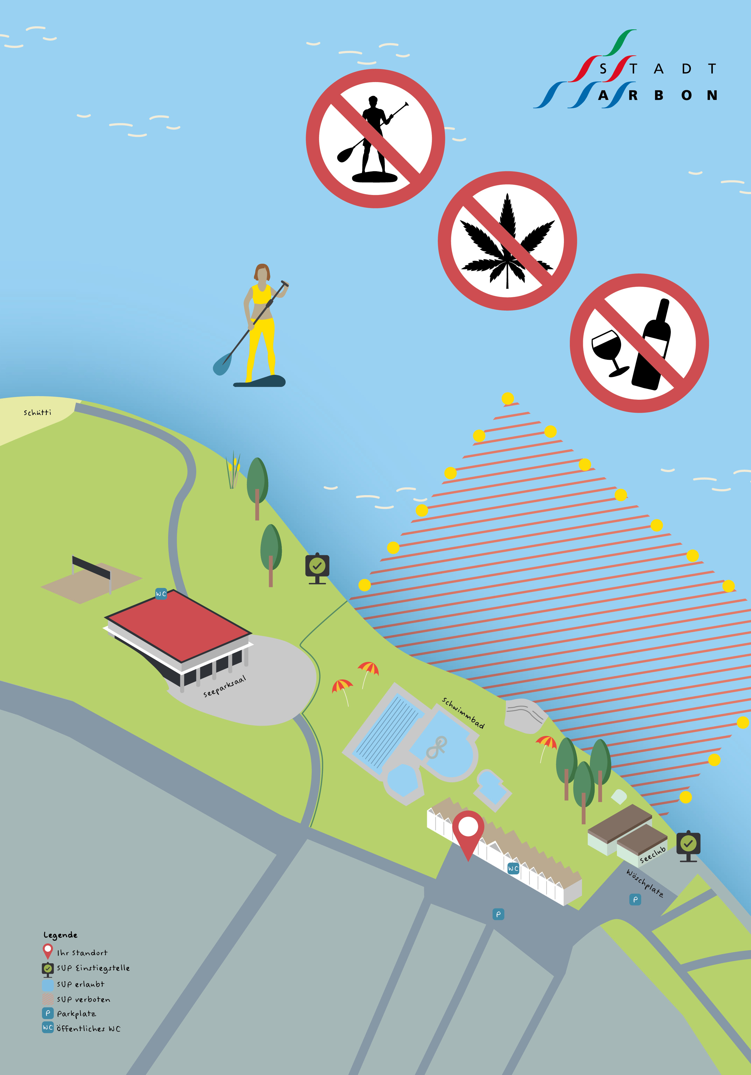 Für die Stand-up-Paddle-Zonen am Bodensee gestaltete SAMON verschiedene Informationskarten zur Orientierung und Kennzeichnung der erlaubten Bereiche. Für die Stadt Arbon sowie die Gemeinden Rorschach und Egnach wurden die Karten individuell illustriert und gelayoutet. Die Gestaltung verbindet funktionale Übersicht mit einer klaren, ansprechenden Ästhetik, sodass sich die Stand up PaddlerInnnen einfach zurechtfinden. Die Arbeiten umfassen Illustration, Kartengrafik und Layout – umgesetzt in engem Austausch mit den verantwortlichen Stellen.